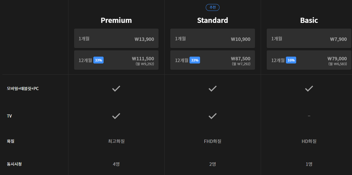 웨이브 요금제는 가장 낮은 베이직 부터 스텐다드, 프리미엄 3가지 종류의 이용권으로 구성되어 있습니다. 세 종류의 요금제 모두 모바일과 PC 등의 기기를 지원하고 있으며, VOD와 라이브 등의 콘텐츠를 모드 동일하게 시청할 수 있도록 지원하고 있습니다. 각 요금제의 차이점은 시청 화질과 동시시청 지원 한도에 따라 가격차이가 발생합니다.