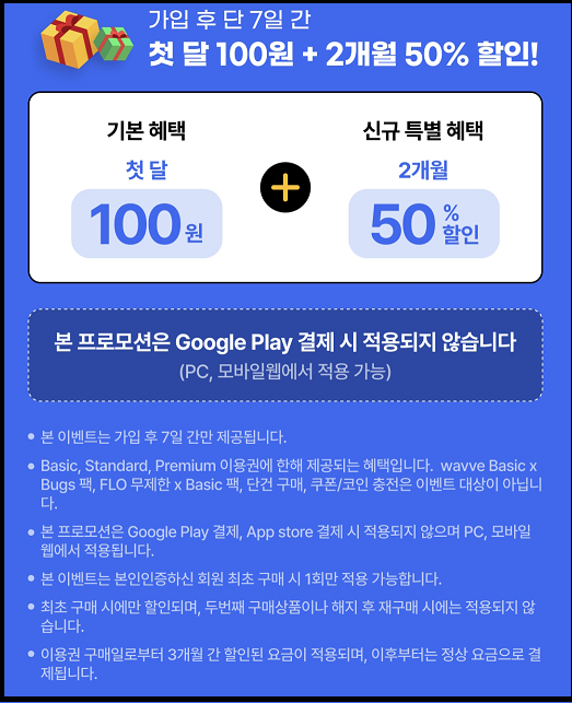 첫 달 100원 혜택과 더불어 놓치지 말아야 할 웨이브 할인 프로모션이 있습니다. 회원 가입 후 7일 이내에만 혜택을 받을 수 있는 프로모션으로 이용권 2개월 50% 할인 프로모션이 있습니다. 회원가입 후 첫달 100원 혜택과 2개월 50% 할인 혜택까지 받으면 총 3개월 동안 3분의1 가격으로 이용할 수 있습니다. 가입 시 꼭 확인하셔서 할인 혜택 받으시길 바랍니다.