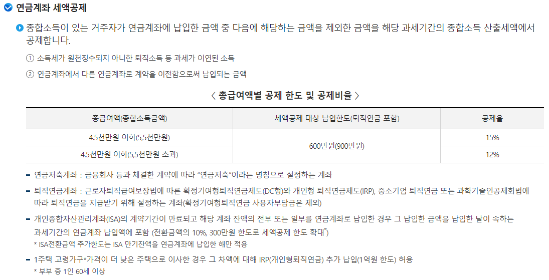 오늘은 세액공제 항목 중 하나인 연금계좌 세약공제에 대해 확인해보겠습니다.