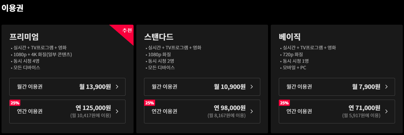 티빙 요금제 이용권 비교
